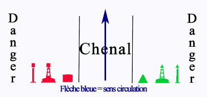 Rouge bâbord et vert tribord pour la région A. Les couleurs se lisent en venant du large dans le chenal. Il est utilisé dans les chenaux, les entrées ou passages.