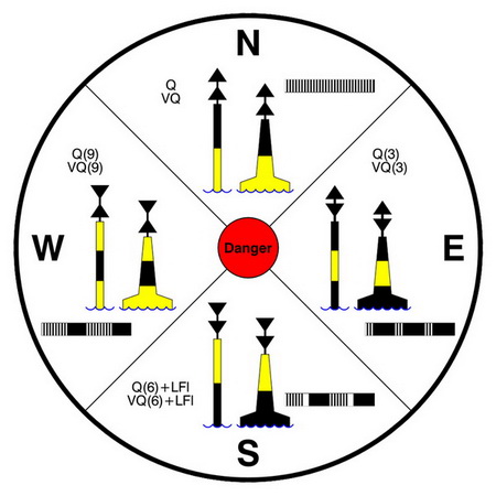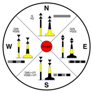 Les marques cardinales se placent au Nord au Sud à l’Est ou à l’Ouest du danger. Les quadrants d’eaux saines se trouvent donc respectivement au Nord au Sud à l’Est et à l’Ouest de la marque. Ces marques se composent d’une bouée à rayures horizontales noires et jaunes, des voyants coniques et feux à scintillement blanc.